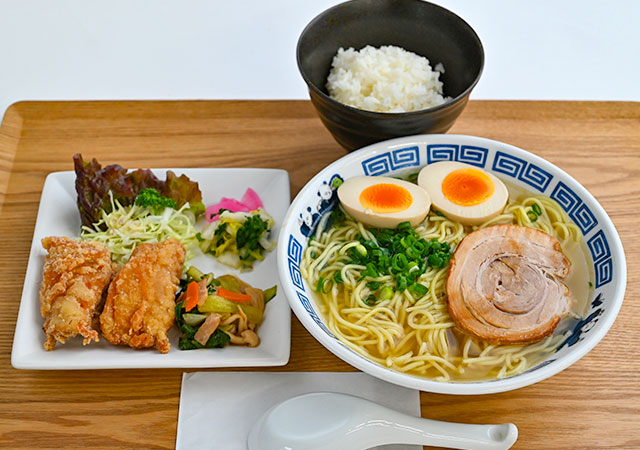 If you add 300 yen to your favorite noodle menu, you can have a set meal with rice and a plate. Free extra large servings of rice!