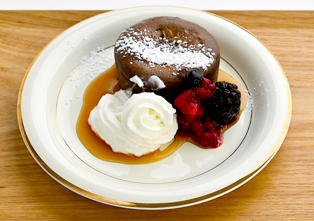 Overflowing with creamy chocolate, this special sweet is topped with sweet and bitter fruit and light fresh cream.