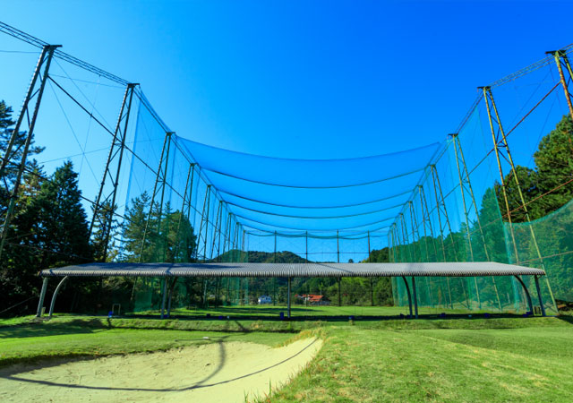 Features bunkers, approaches, and a putting green in addition to a driving range.